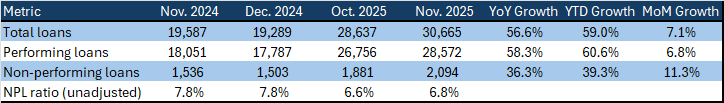 Preliminary loan data from financial consumer watchdog Condusef showed Nubank stayed on an aggressive growth mode in November, with performing loans expanding 6.8% MoM, accelerating from 5.0% in October, in its fifth consecutive month with sequential growth above 4%. Annualized growth stood at 58.3%, down marginally from 58.6% last month. On the other hand, even without write-off data it’s clear credit quality remains a concern: the NPL ratio stood at 6.8%, up from 6.6% the previous month. (Condusef’s website crashed over the weekend before we downloaded the data on Klar and Stori. “Gather ye rosebuds while ye may”, Robert Herrick would say.)