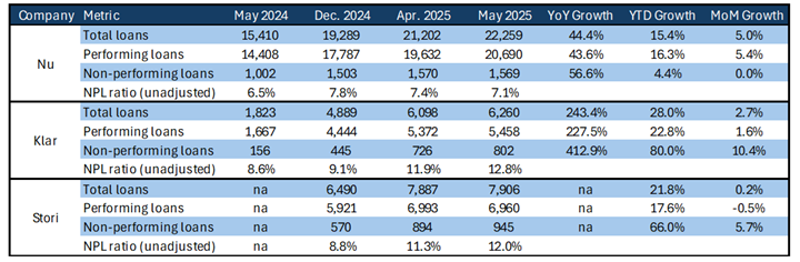 Condusef preliminary data for May showed Nu’s growth in loans regaining momentum, while Klar and Stori reported deteriorating NPL trends. Given the limited nature of the Condusef data, it’s not possible to fully determine yet underlying credit quality, with NPLs reduced by consistently high write-offs, especially at capital-heavy Nu. According to separate earlier CNBV data, as of March Nu’s adjusted NPL ratio (after write-offs) stood at 20.8%, just above Stori’s 17.1% and Klar’s 19.5%.