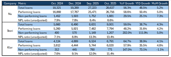 Preliminary loan data from financial consumer watchdog Condusef showed more consistent growth among the three main Sofipos in October. Stori and Klar, which averaged less than 2% MoM growth during 3Q25, saw loans accelerating at 4.2% and 4.8%, respectively, growing in October essentially the same as in all of the past quarter. For its part, Nubank continued to lead growth at 5.0%, its fourth consecutive month growing above 4%. Without write-off data, not much can be said about credit quality, other than both Nu and Stori saw (unadjusted) NPLs outpace performing loans in the month.