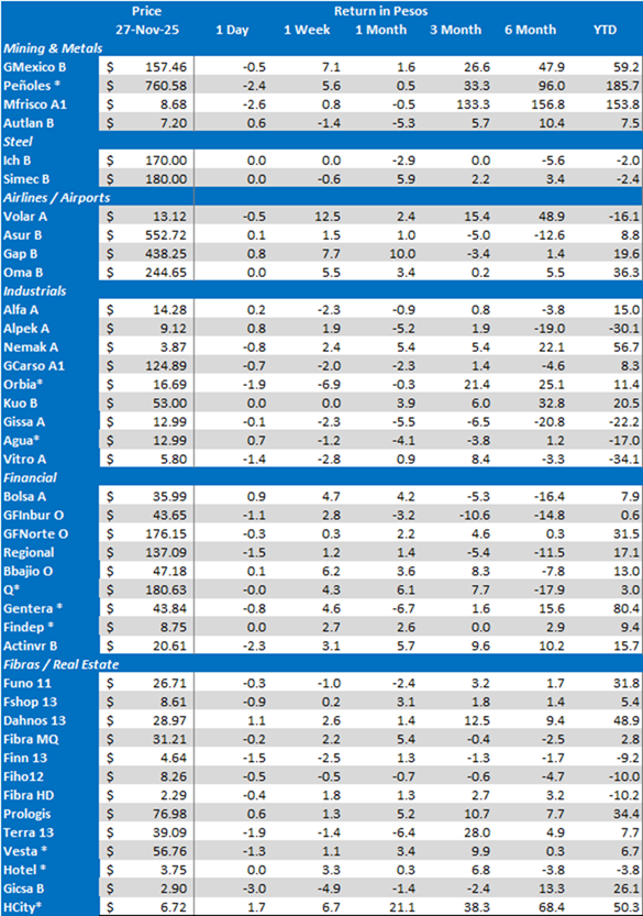 The S&P / BMV IPC’s top gainers were: GMEXICO B (+7.1%), BBAJIO O (+6.2%) and PEÑOLES * (+5.6%). On the other hand, the main losers were: ALFA A (-2.3%), KOF UBL (-1.8%) and WALMEX * (-1.7%).