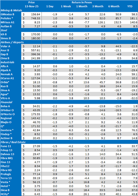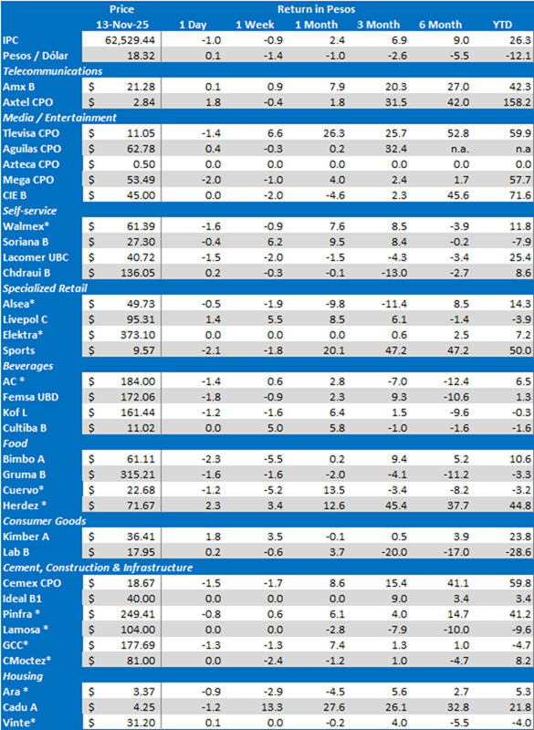 The S&P / BMV IPC’s top gainers were: ORBIA * (+6.7%), TLEVISA CPO (+6.6%) and LIVEPOL C (+5.5%). On the other hand, the main losers were: GENTERA * (-6.6%), BIMBO A (-5.5%) and GCARSO A1 (-5.3%).