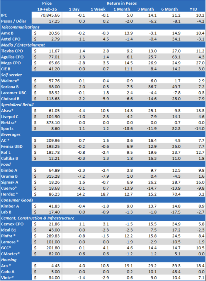 Grupo Herdez reported solid 4Q25 results. Net sales were up 9.3% YoY driven by Preserves (mayonnaise, vegetables, spices and mole), Impulse (multipack and take-home Helados Nestlé with higher average ticket), and Exports (higher volumes of salsas and vegetables), while volumes rose 4.8% supported by wholesale and price clubs. Gross profit increased 13.0% with a 130-bps gross margin improvement on favorable mix in Preserves and FX and input relief in Exports, partially offset by cocoa cost pressure and channel mix in Impulse. EBITDA grew 13.0% with a 60-bps margin expansion as Preserves and Exports more than compensated Impulse softness. Net income increased 20.1% supported by operating leverage and a strong equity contribution from MegaMex following operational improvements in Don Miguel and guacamole. In 2026, the company expects a 7-9% revenue growth with operating cash flow between MXN$2.5-2.7 billion. Herdez will propose the payment of a MXN$15.0/share cash dividend (19.9% yield) at its March 6th ordinary shareholders’ meeting.