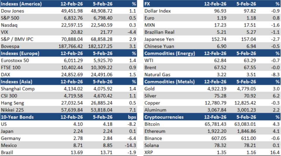En S&P / BMV IPC subió 2.9% para cerrar en 70,888.04 pts, después de alcanzar un nuevo máximo histórico intradía el jueves, debido al sólido informe de AMX, algunos datos macroeconómicos positivos y el tono de riesgo global. Mientras tanto, el peso mexicano se apreció 1,6% para cerrar en MXN$17,23/USD; la rentabilidad del M-Bono a 10 años bajó 14 pb hasta 8,71%.