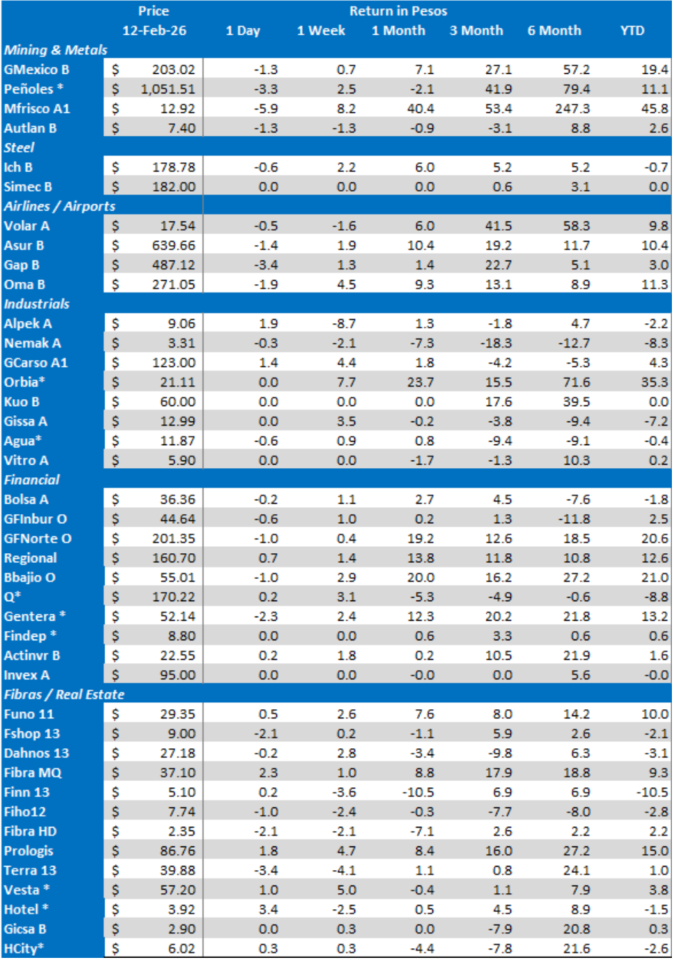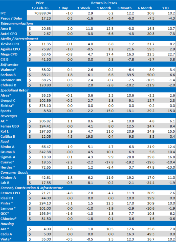 AMX registró resultados positivos en el 4T25, con una subida de 11,3% en la semana. Los ingresos aumentaron 3,4% interanuales, apoyados por el impulso del servicio móvil, la expansión de la banda ancha y la fortaleza de las ventas de equipos. Los ingresos por servicios aumentaron 2,3% interanuales, reflejando un crecimiento de los ingresos por servicios móviles de 6,2% a tipos de cambio constantes gracias a la tracción del pospago y a la resistencia de la demanda de prepago. Las altas netas de pospago alcanzaron los 2,8 millones, lideradas por Brasil, Colombia y México, mientras que las altas netas de prepago contribuyeron con 647.000, principalmente de México, Argentina y Colombia, y las altas netas de banda ancha totalizaron 524.000, impulsadas por el despliegue de fibra en México y Brasil. El EBITDA creció 4,2% interanuales gracias al control de costes y al apalancamiento operativo, con un margen de EBITDA de 38,8%, 30 pb más que el año anterior. El beneficio neto aumentó más de 300% interanuales, mientras que los costes financieros globales se redujeron aproximadamente 48% interanuales. La deuda neta en relación con el EBITDAaL se situó en 1,52 veces, después de que el flujo de caja libre aumentara 39,4% interanuales y la generación de caja redujera la deuda neta. La compañía prevé un Capex de 14-15% de ingresos. AMX perdió la oferta por los activos chilenos de Telefónica frente a Millicom/NJJ Holding. Sin embargo, la empresa mexicana de telecomunicaciones busca reducir el apalancamiento para acometer adquisiciones en Latinoamérica.