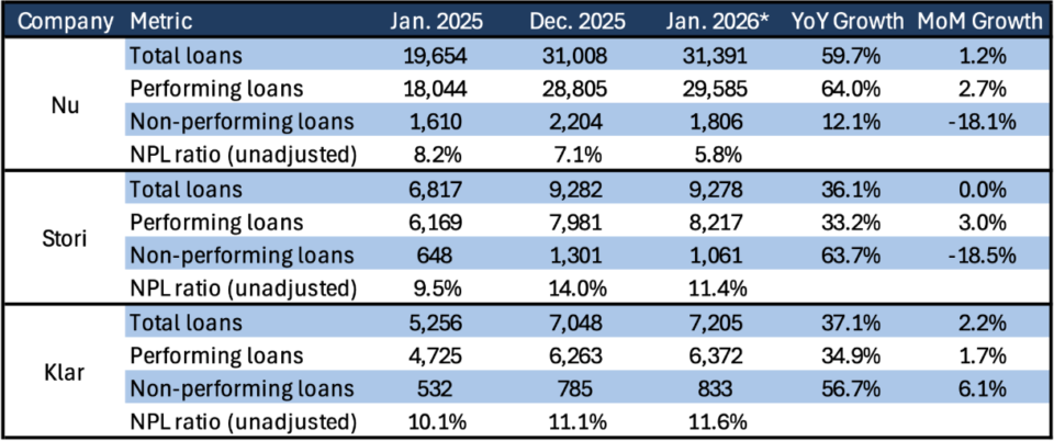 Los datos preliminares sobre préstamos de la Condusef mostraron un comienzo de año relativamente fuerte, con un aumento intermensual de 2,7% en Nu, 3,0% en Stori y 1,7% en Klar. Sin embargo, observamos que las cifras no son totalmente comparables con las del año pasado, ya que las Sofipos tuvieron que adoptar la NIIF 9 a partir de 2026, que cambia la forma de clasificar los préstamos entre productivos (ahora denominados fase 1 y 2) y no productivos (ahora fase 3). De hecho, observamos que Nu actualizó sus cifras presentadas después de que algunos informes de ventas destacaron un fuerte aumento en la morosidad, originalmente reportada en 9.9% (un deterioro notable de 7.1% en diciembre), posteriormente actualizada a 5.8% (lo que podría indicar una notable mejora, aunque sin datos de castigos, no se pueden derivar conclusiones firmes); curiosamente, la cartera total reportada se mantuvo sin cambios en MXN 31.4 mil millones, un aumento secuencial de 1.2%.
