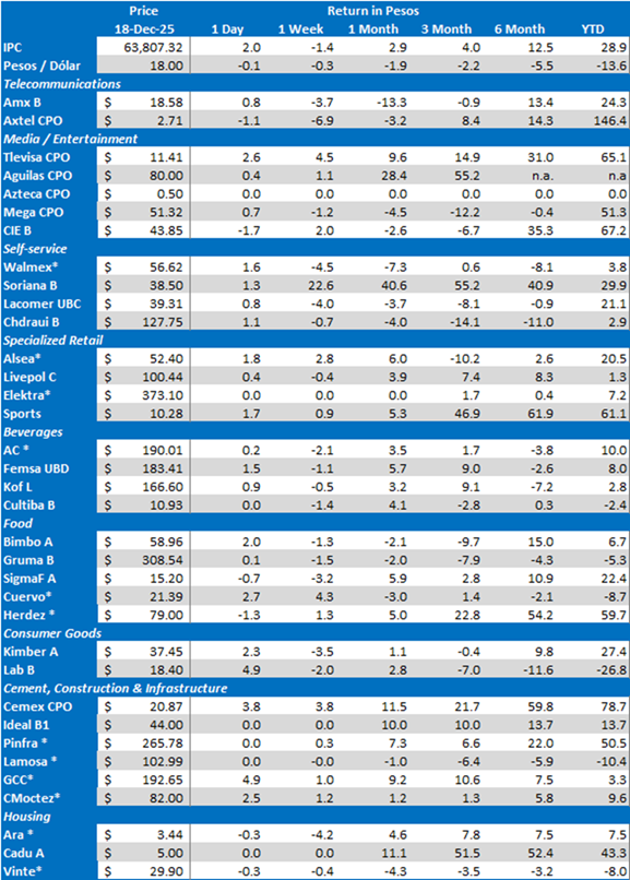 The S&P / BMV IPC was down 1.4% over the week, pressured by the correction in US equity markets due to concerns on high valuations of IA related stocks. Meanwhile, the Mexican peso gained 0.3% to close right at the psychological level of MXN$18.00/USD; and the yield of the 10-year M-Bono was down 3 bps to 9.08%.